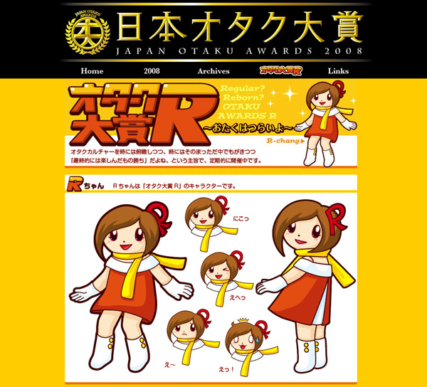 「オタク大賞R」のロゴ、キャラクター、Rちゃんなどなど。